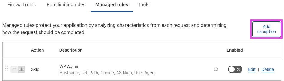 Next, you want to use the information from your Firewall logs to select which rules to skip by adding an exception. For WordPress, I’ve chosen the following: